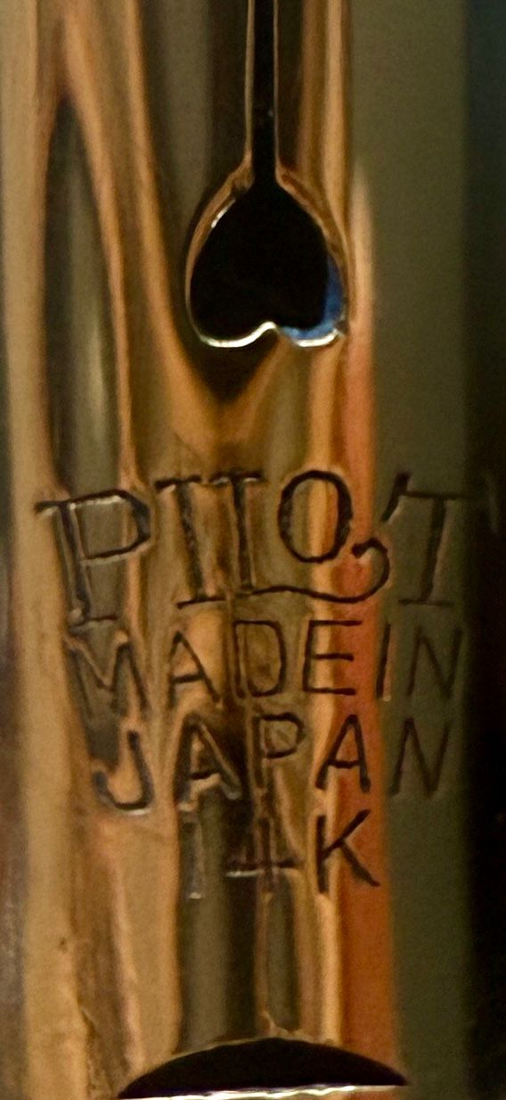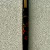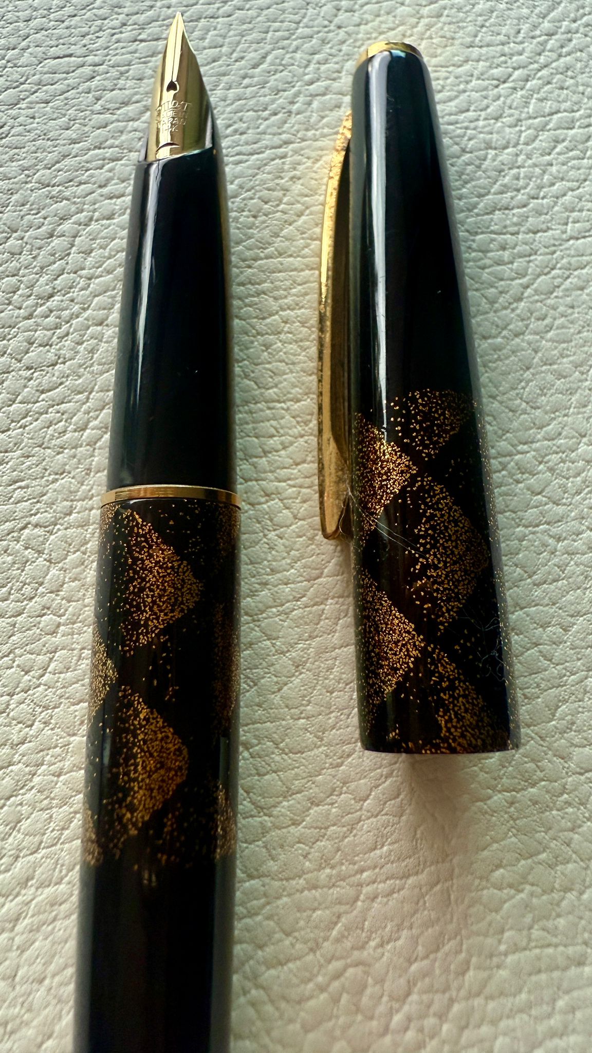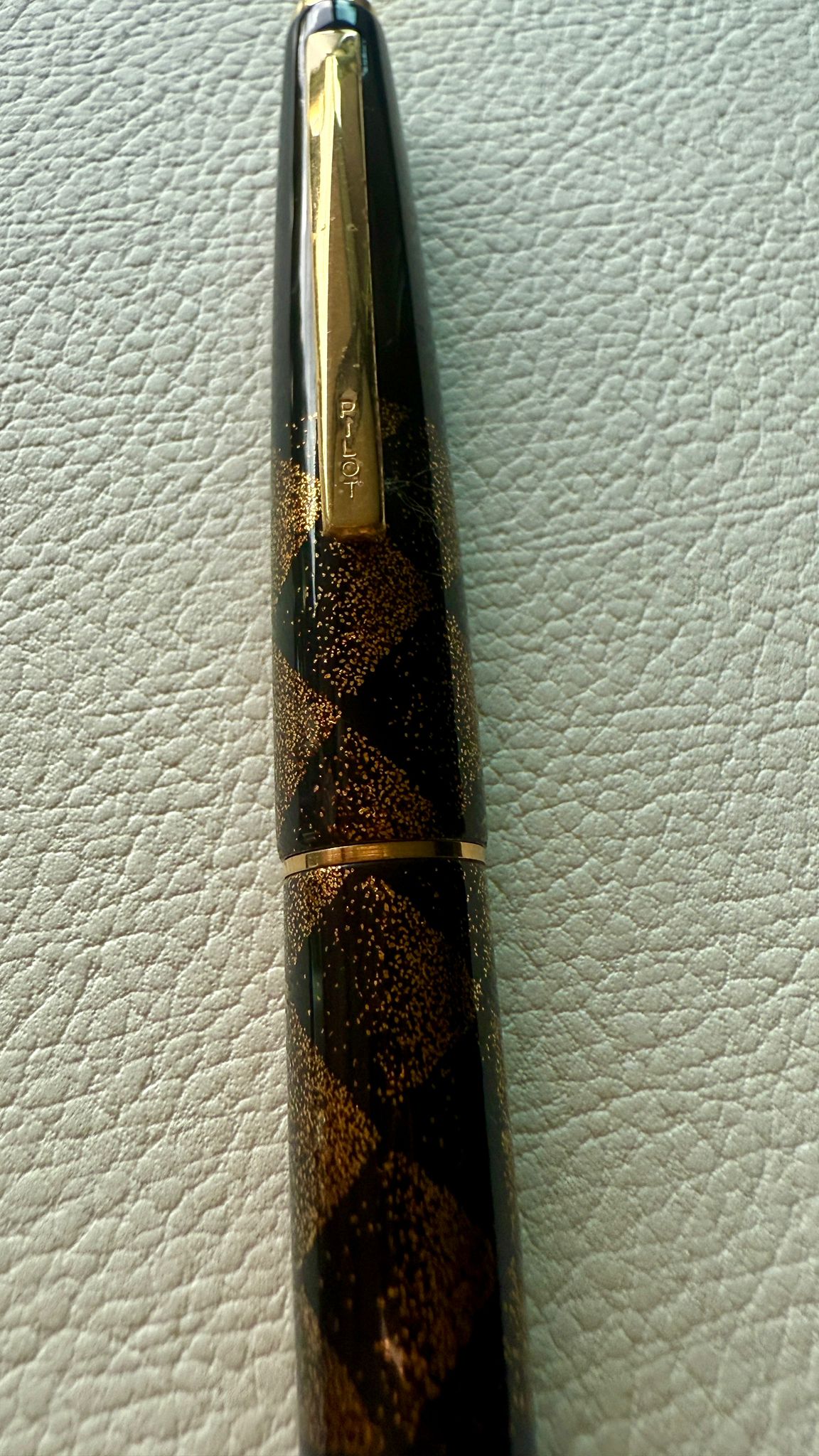 Esta estilográfica vintage de Pilot es un ejemplo único de la tradición artesanal japonesa. Su cuerpo de ebonita recubierta con laca urushi negra está decorado con patrones geométricos aplicados mediante la técnica Maki-e, que combina laca y polvos metálicos para lograr un acabado brillante y duradero.