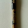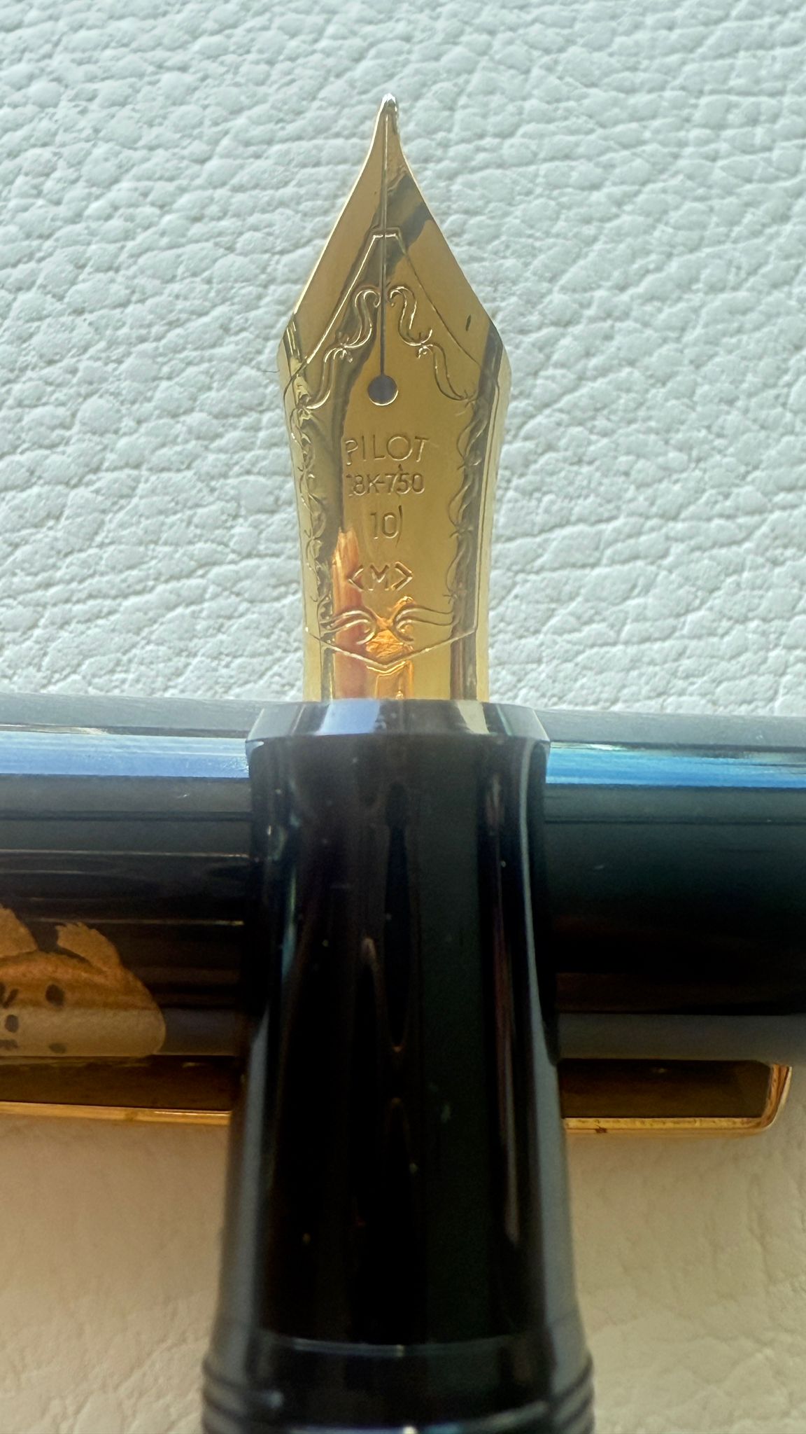 Fabricada en ebonita —material tradicional por su ligereza y resistencia— y decorada mediante las técnicas de taka maki-e (laca en alto relieve) y jim-maki-e (aplicación de polvo de oro), esta estilográfica es un ejemplo sublime del equilibrio entre artesanía y elegancia.