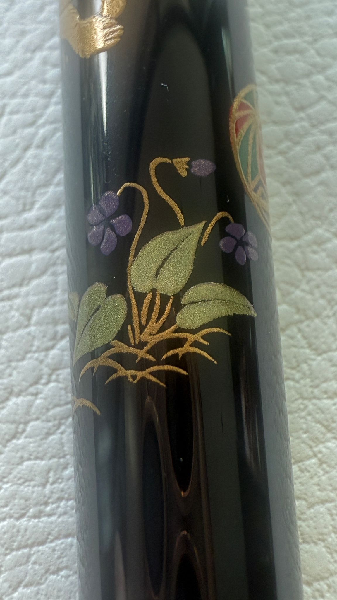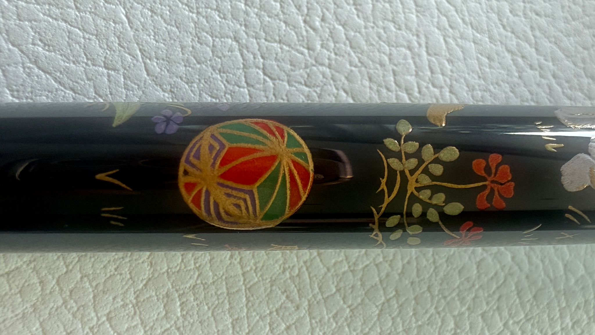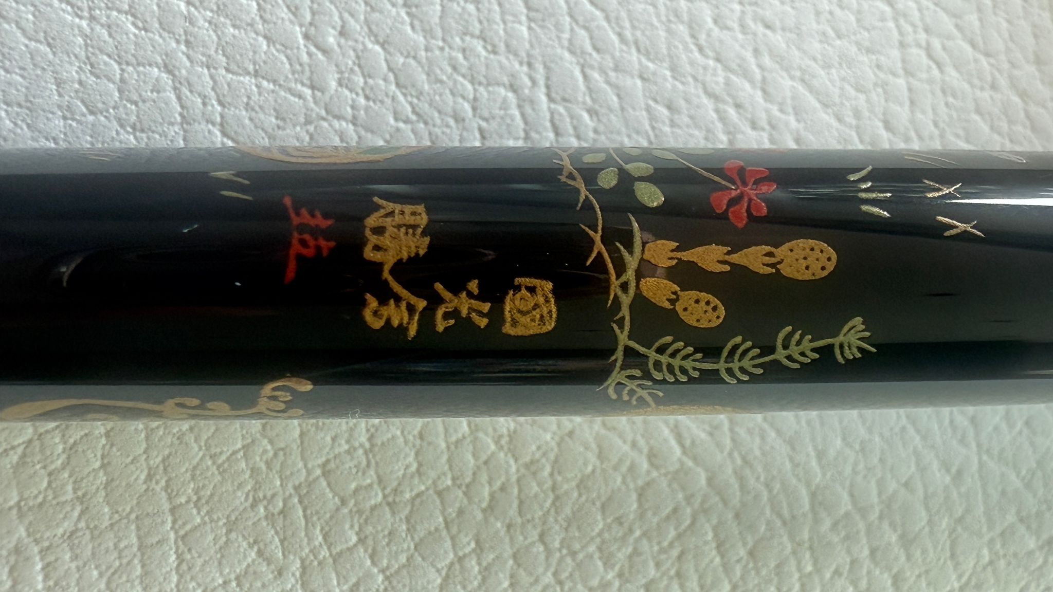Diseñada por el maestro artesano Masaru Hayashi, la pluma presenta un cuerpo cilíndrico de laca negra con una exquisita decoración multicolor.