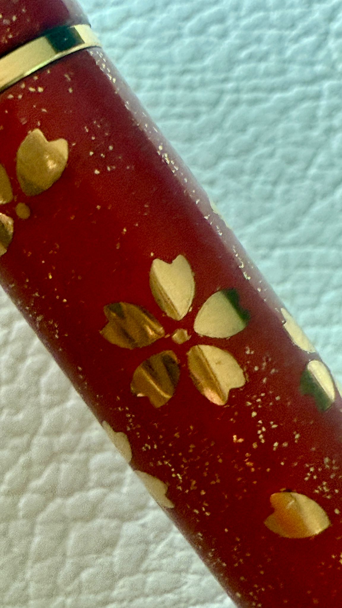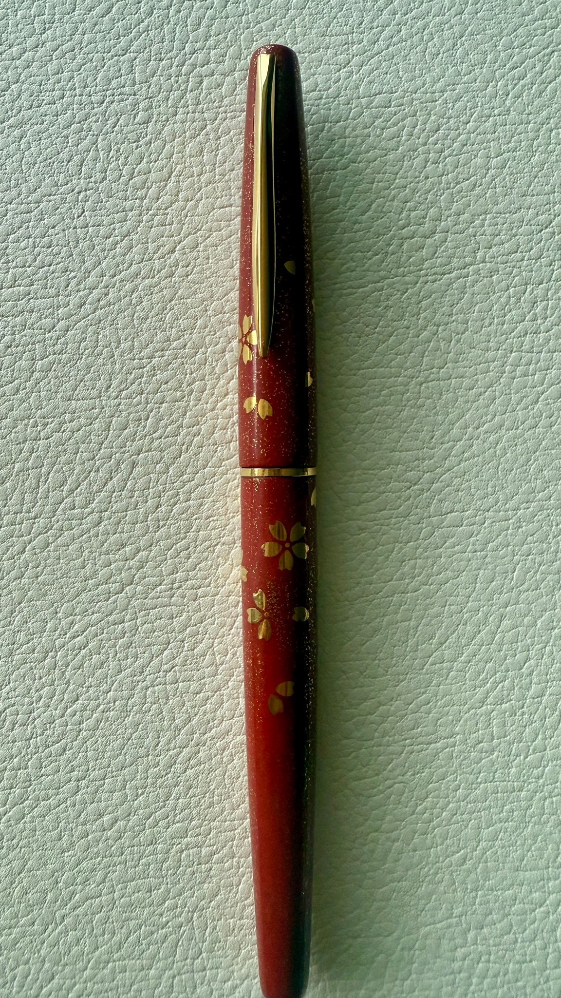 En los años 70, la firma japonesa Pilot alcanzó una cima de refinamiento artesanal con piezas como esta: una estilográfica Sakura Maki-e, decorada a mano con la técnica tradicional Hyōmon, en la que láminas de oro se aplican sobre la superficie de laca negra para dar vida a las icónicas flores de cerezo, símbolo eterno de belleza efímera y renacimiento.
