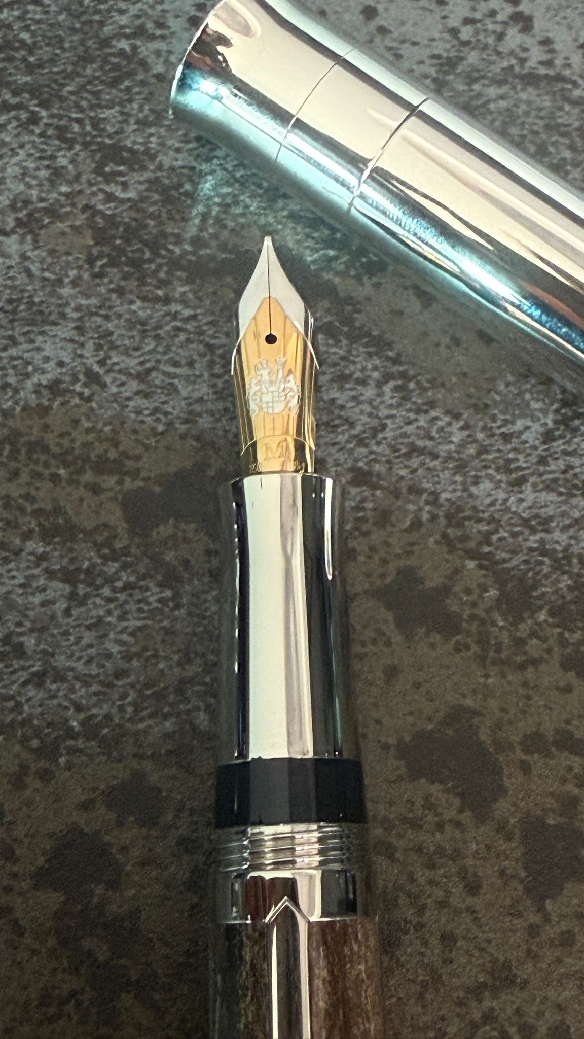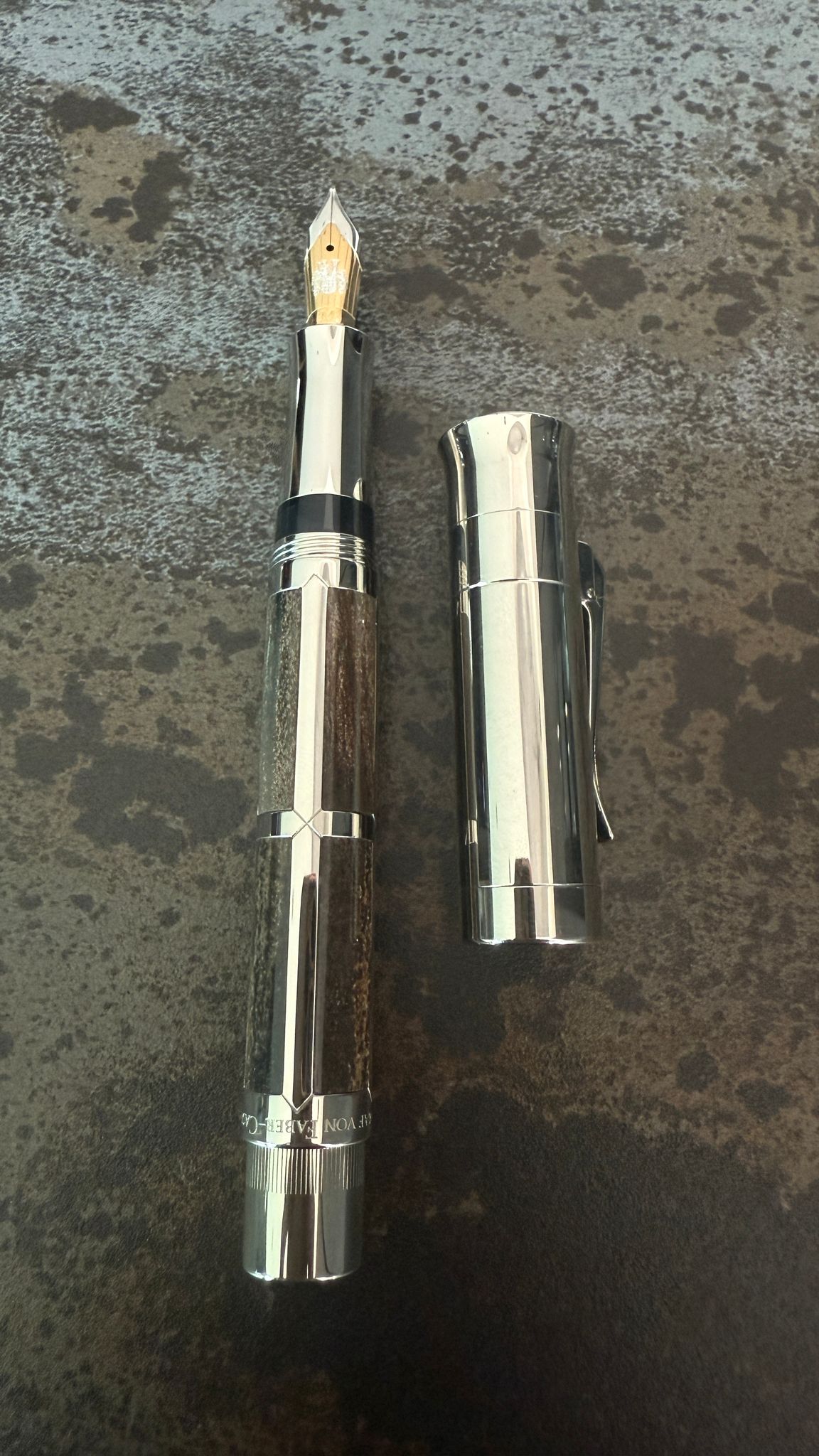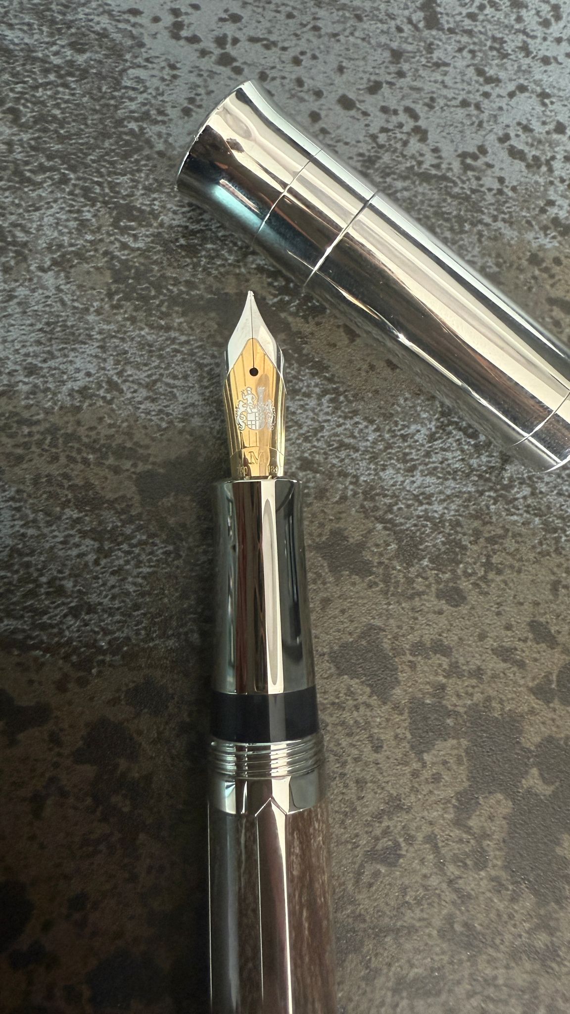 Cada pluma estilográfica es una pieza única: las secciones de madera petrificada son talladas, pulidas y montadas a mano por los maestros artesanos de la firma Herbert Stephan KG, con la precisión de la alta joyería.