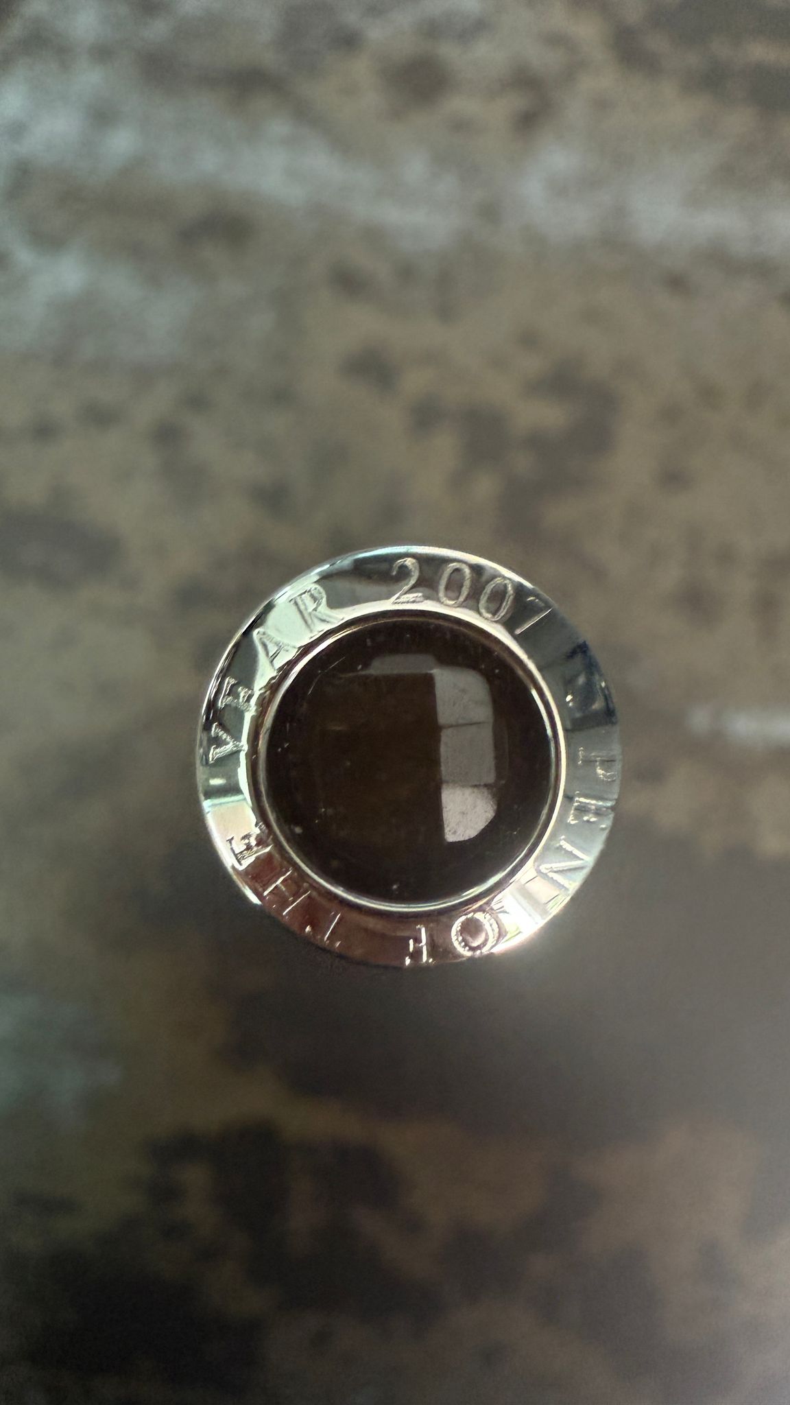 Botón del culote: Incrustado también con madera petrificada. Grabado con “Pen of the Year 2007” y el escudo familiar, acompañado de las inscripciones “Graf von Faber-Castell” y “Germany”.