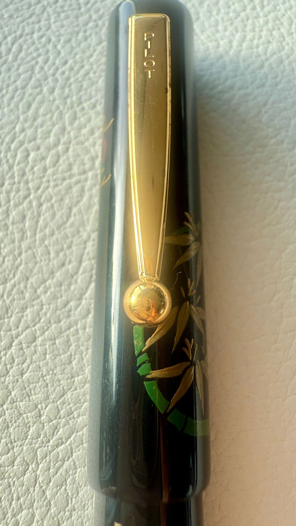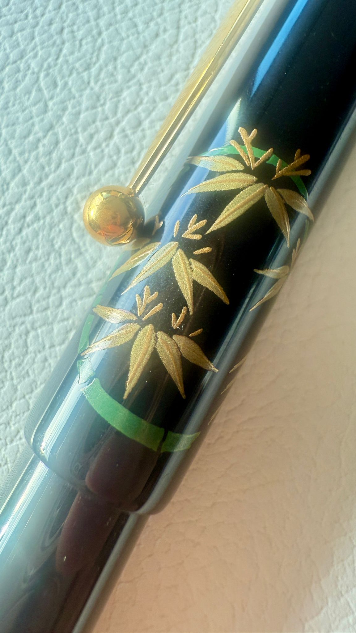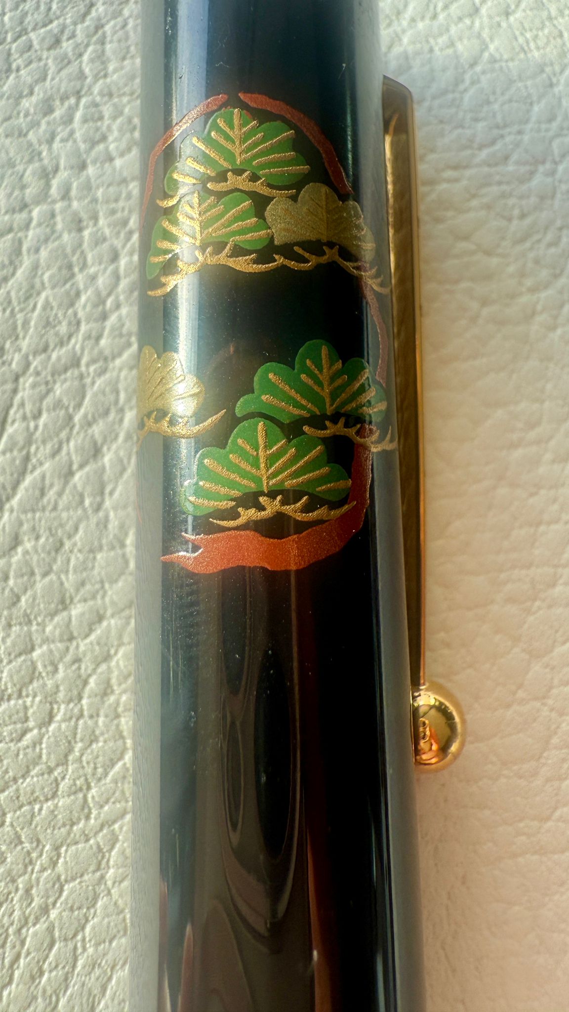 Fabricada en ebonita —material tradicional por su ligereza y resistencia— y decorada mediante las técnicas de taka maki-e (laca en alto relieve) y jim-maki-e (aplicación de polvo de oro), esta estilográfica es un ejemplo sublime del equilibrio entre artesanía y elegancia.