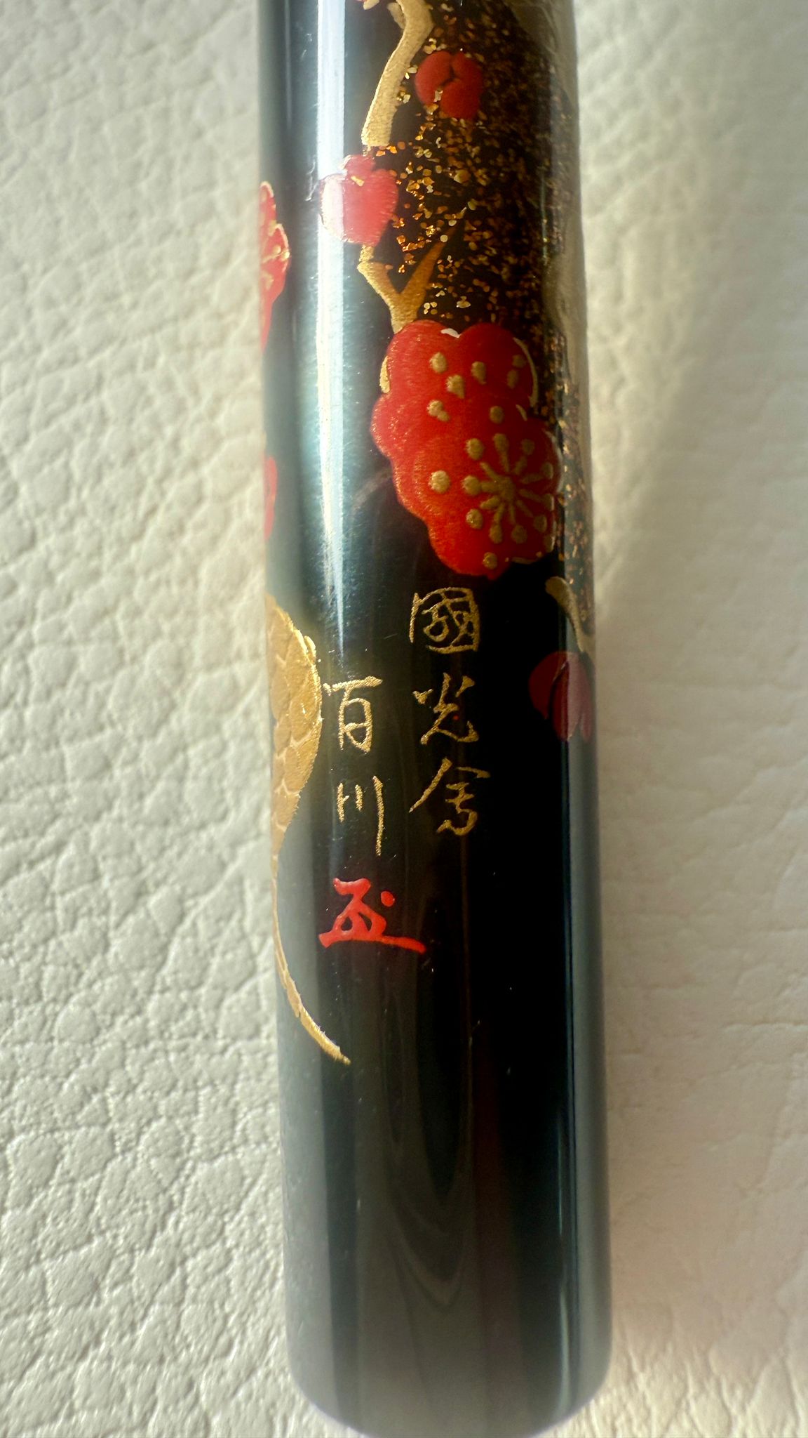 Diseñada por el maestro artesano Hyakusen Murata, la pluma presenta un cuerpo cilíndrico de laca negra con una exquisita decoración multicolor, doblemente firmada por el artista.